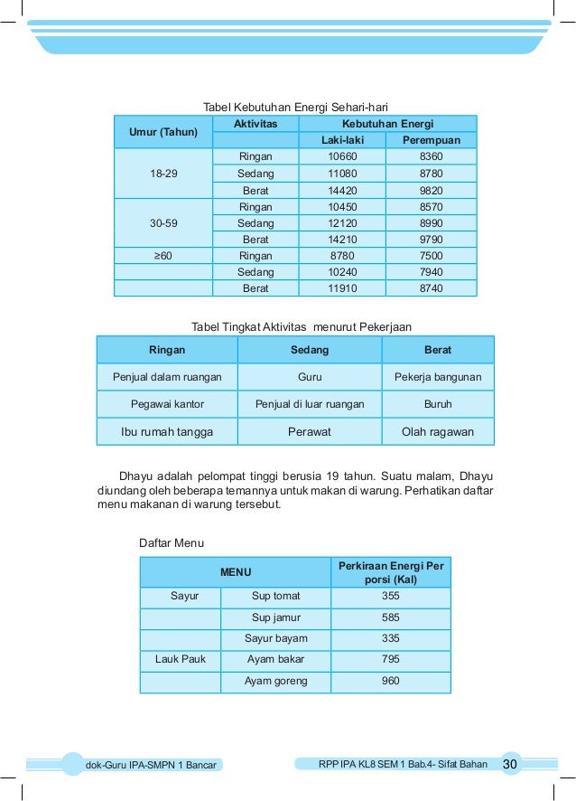 Suatu malam, dhayu diundang oleh beberapa temannya untuk makan di warung. Tinggi ideal remaja perempuan indonesia : Perhatikan daftar menu makanan di warung tersebut. Bantu dhayu untuk mengambil keputusan bila dhayu membeli “menu dengan harga spesial”, apakah sudah sesuai dengan kebutuhan energi yang dianjurkannya? Setelah dihitung, total asupan kalori dari sarapan pagi dan makan siang sebesar 1.700 kkal. Tapi ok lah kan daripada tak naik. Perhatikan daftar menu makanan di warung tersebut. Manakala tinggi ideal untuk seorang wanita adalah 165cm dan lelaki 175cm. Sebab dalam pemeriksaan, perempuan itu mengaku kehilangan ktp dan sudah berusia 19 tahun.