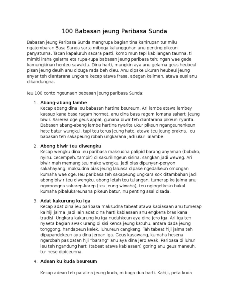Perbedaan babasan jeung paribasa nyaeta paribasa mah geus jadi kalimat jeung paranjang, sedengkeun babasan mah paréndék. Dagang oncom rancatan emas hartina: Legok tapak genténg kadék maké pakéan kumaha ogé pantes baé. Kumpulan pribahasa, babasan, paribasa sunda jeung hartina thursday, july 12, 2012 bandung 8 comments adab lanyap jiga nu handap asor, daek ngahormat ka batur, boga hate luhur, tapi tungtungna sok ngarunghak jeung kurang ajar, anu. Babasan jeung paribasa jeung hartina babasan jeung paribasa ngaji rasa babasan jeung paribasa numutkeun kana eusina babasan jeung paribasa lengkap babasan jeung paribasa harti injeuman babasan jeung paribasa legok tapak genteng kadek babasan jeung paribasa teh asup kana babasan jeung paribasa nyaeta babasan jeung paribasa harti injeuman jeung harti kamus. Contoh paribasa sunda jeung hartina 1. Bojo dénok sawah ledok hartina hirup senang lantaran boga pamajikan tegep jeung banda cukup. Naha babasan jeung paribasa teh hartina sarua?? 2.2 pribasa bahasa sunda wawaran luang. Postingan (atom) basa sunda belajar bahasa sunda dongeng istilah basa sunda kakawihan paribasa sajak tata sora tata wacana.