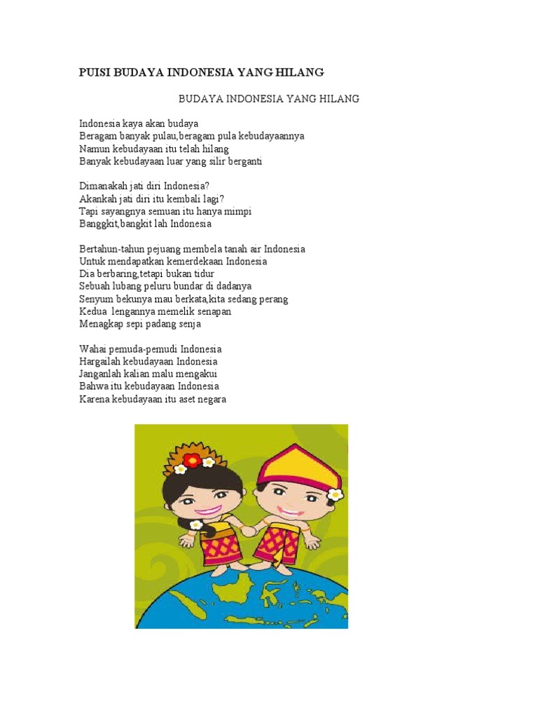 Di lereng lereng para peminum mendaki gunung mabuk kadang mereka terpeleset jatuh Jumlah baris pada setiap bait puisi tersebut adalah. Yang terkenal akan ramah tamahnya. Berisi ungkapan rasa terimakasih dari seorang murid kepada gurunya yang telah. Puisi tersebut mengandung makna kecintaan pada negara indonesia. Puisi cinta tanah air indonesiaku “salam rindu dari pejuang devisa”. Puisi di atas merupakan contoh puisi yang dibuat oleh seorang anak sekolah dasar tentang tema negara. Puisi aku bangga menjadi anak indonesia. Puisi bertema indonesiaku, puisi bertema indonesiaku minimal 7 baris.