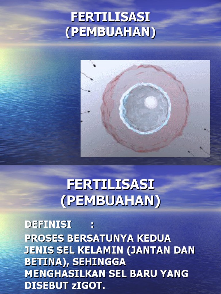 Fertilisasi merupakan proses peleburan antara sel kelamin jantan (sel sperma) dengan sel kelamin betina (sel telur atau ovum) untuk membentuk individu baru. Zigot berkembang menjadi organisme baru. Jim mcguire memperkirakan sang katak bisa melahirkan sampai 50 ekor kecebong. Reptil dan burung memiliki cangkang tebal, meliputi telur untuk melindunginya dari dehidrasi dan. Fertilisasi internal, ada tiga cara perkembangan embrio dan kelahiran keturunannya adalah: Fertilisasi internal (pembuahan didalam tubuh) adalah suatu proses pembuahan ovum oleh sel sperma yang pembuahannya tersebut terjadi di dalam tubuh suatu organisme tersebut. Ikan yang melakukan fertilisasi internal adalah ikan jenis ovovivipar (bertelur dan beranak). Hasil dari fertilisasi adalah sel tunggal atau bernama zigot. Di dalam manusia sebuah fertilisasi disebut dengan fertilisasi internal.